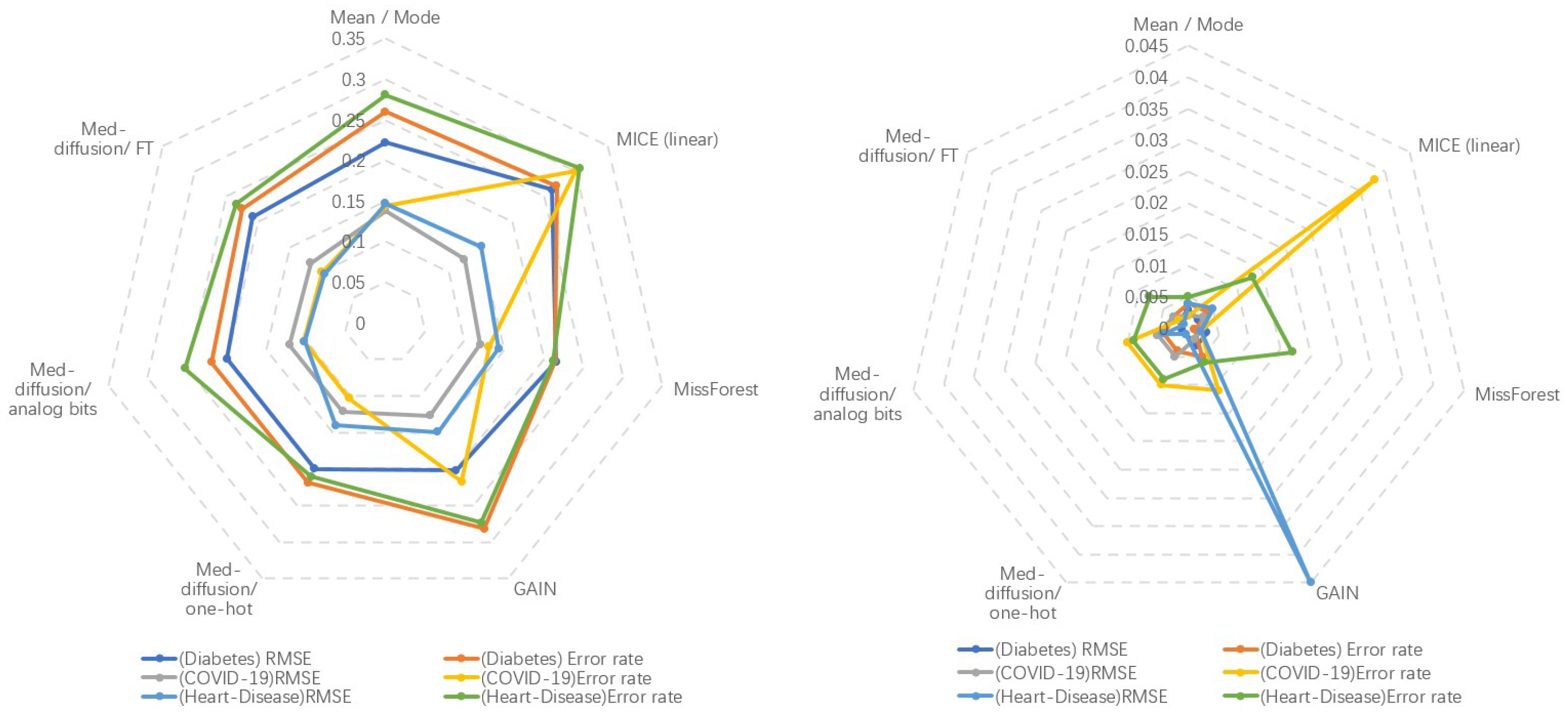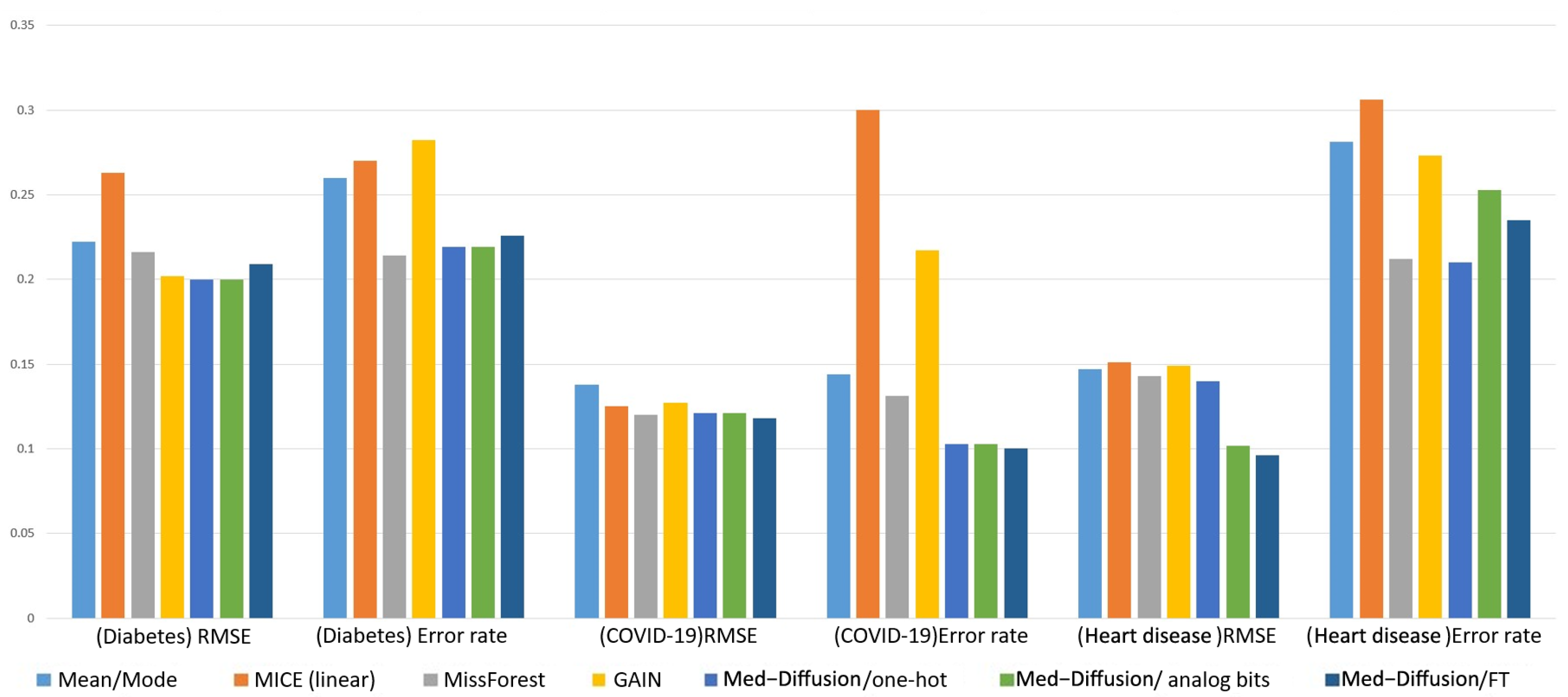 - Our experimental results show that Med-Diffusion reduces error rates and the RMSE (Root Mean Square Error) by 4.4% and 5.1%, respectively, compared to existing probabilistic methods for healthcare and environmental data.