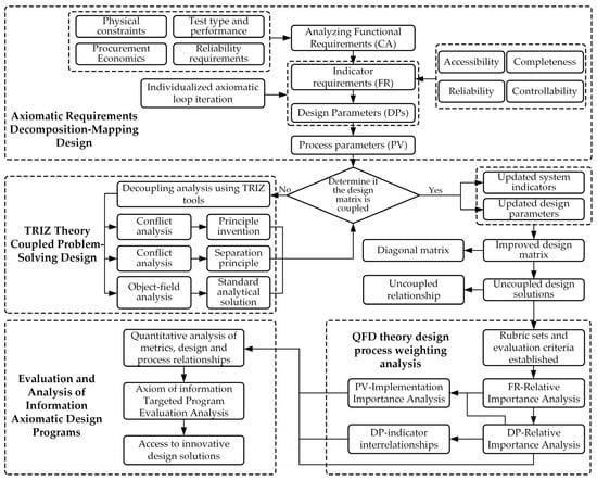 In addressing the challenges posed by high-overload testing equipment, which traditionally relies heavily on the experience-based characteristics of designers, and the varying design methods and work efficiencies of designers with different levels of experience when tackling specific issues, in this paper, we propose a design process and evaluation method adaptable to designers of any experience level. Under this approach, researchers can focus their limited time and resources on resolving specific testing issues without needing to concern themselves with the correctness of the design process. This paper primarily combines axiomatic design (AD) with TRIZ problem-solving theory. This method employs a three-layer technical decomposition framework: requirement–parameter mapping, where overall technical specifications are gradually decomposed into independent functional requirements (FRs) and technical parameters (TPs), and a design matrix is constructed to facilitate requirement transmission; conflict identification and resolution, where based on the design matrix, conflict structures are identified through coupling analysis, and TRIZ contradiction matrices are utilized to invoke innovation principles (such as the segmentation principle and pre-compensation principle) to reconfigure design solutions; and procedural quantitative evaluation, where a multi-criteria evaluation system covering reliability, accuracy, cost, and manufacturability is established and the entropy weight–AHP method is combined to quantify the comprehensive score of the procedure. A design example demonstrates the specific design process of this method, and an overload testing device was developed using this design method. In actual use, the device can effectively complete testing tasks and significantly shorten the process of modifying preliminary designs. This method effectively addresses issues caused by excessive reliance on empirical methods in traditional design: By replacing trial-and-error iteration with AD’s “zigzag decomposition path”, the development cycle is significantly shortened while improving conflict resolution efficiency. The TRIZ toolkit reduces the time required to resolve typical technical conflicts, strengthens the objective evaluation of design solutions, and minimizes design preference biases through integrated evaluation models. The resulting modular high-load testing equipment framework validates the engineering applicability of this method. This framework provides a quantifiable, reusable system paradigm for the design of extreme environment testing equipment, and its “demand-driven conflict resolution–comprehensive evaluation” logic can be extended to the development processes of similar equipment.