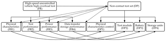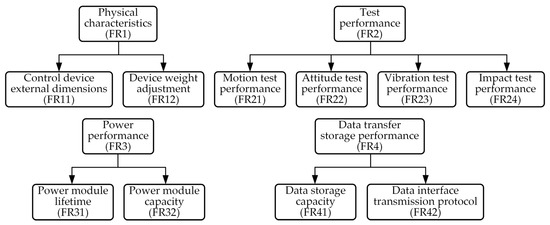 In the design process, the first step is to establish specific performance requirements for the test equipment. By using the functional requirements of different types of high-load test equipment as input conditions for system design, we apply functional decomposition theory and axiomatic design theory to achieve the independence and decoupling of functional design [7]. This independence should be realized in both spatial and temporal dimensions. Spatial independence refers to the physical separation of components through spatial layout during implementation. Functional requirements (FRs) must correspond one-to-one with design parameters (DPs) to avoid coupling (i.e., modifying one DP does not affect other FRs). If spatial independence cannot be achieved during the design phase, temporal independence must be ensured, with process variables (PVs) controlled independently in a time series to prevent interference between different stages of operation. When both types of independence cannot fully meet all functional requirements, additional components must be introduced to achieve specialized functional design. In the field applied in this paper, spatial independence means that various testing requirements must be met independently; for example, overload testing capability (overload sensor), attitude testing capability (attitude sensor), and corresponding functions must be performed by independent execution units. However, due to the integration of microelectronics technology, these components are integrated into a common module. Therefore, designers must plan the execution sequence to ensure the parallel execution and simultaneous recording of the test object’s state, which is a logical temporal execution sequence. This must be planned during the design process.
