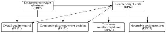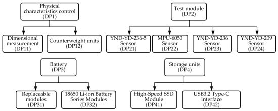 Based on the axiomatic design principle, the requirements described in Section 3.1 can be further refined to ultimately form the test equipment functional domain (FRi) parameters shown in Figure 2. Based on these requirements, the test equipment can be developed with four core functions: physical characteristics (FR1), test performance (FR2), power supply performance (FR3), and data transmission and storage function (FR4). The corresponding physical domain includes four problem-solving modules, namely physical characteristics control unit (DP1), test unit (DP2), battery unit (DP3), and storage unit (DP4), as shown in Figure 3. Although this level of functional decomposition has partially clarified the functional domains and physical domains, further refinement is still required. Specifically, the physical characteristics control unit is primarily responsible for verifying whether the physical dimensions and mass characteristics of the test equipment meet the standards of real high-speed unmanned aerial vehicles. This requires further decomposition into equipment dimension control (FR11) and weight adjustment (FR12), with specific implementations including overall dimension control and measurement of the test equipment (DP11) and design and adjustment of the weight unit (DP12). The test apparatus primarily performs status measurements at different operational stages of the launch platform system, with the core objective of achieving optimal test performance. Based on historical data analysis, the system needs to measure four key parameters: motion (FR21), attitude (FR22), vibration (FR23), and impact parameters (FR24). To meet these requirements, four dedicated modules have been designed: the YND-YD-236-5 motion parameter sensor (DP21) for motion parameter detection, the YND-YD-236 vibration sensor (DP23) for vibration analysis, the YND-YD-209 impact sensor (DP24) for impact response assessment, and the YND-YD-6050 attitude sensor (DP22). As a critical component ensuring system reliability, the battery module must have sufficient charge/discharge cycle life (FR31) and standard energy capacity (FR32). Quantitative specifications have been established for both parameters. The current configuration uses replaceable 18,650 lithium batteries (DP32) connected in series to form battery cells (DP31), with specific models selected based on operational requirements. The storage unit must ensure that test data is fully preserved and retained without loss (FR41) and that data is promptly transmitted after testing (FR42). Therefore, a high-speed SSD storage medium (DP41) is used for data recording, and the data/charging interface is configured to USB 3.2 Type-C specifications (DP42), with the specific mapping relationships shown in Figure 4 and Figure 5. By decomposing the three functional domains and physical domains, the high-overload test device has achieved its basic physical implementation. However, to conduct an in-depth analysis of the weight adjustment design process (FR12), a fourth-level decomposition is required. As shown in Figure 6, this weight adjustment process can be decomposed into overall quality control of the test equipment (FR121) to meet the quality requirements of standard high-speed drones. Under this quality standard, a weight distribution positioning scheme (FR122) was simultaneously designed. This ultimately formed the specific functional weight unit mass (DP121) and its installation location within the test equipment (DP122), thereby establishing the overall functional design mapping system for the high-load equipment. A design coupling analysis was conducted on the developed mapping structure, with the product design matrix shown in Equation (1) [12]: