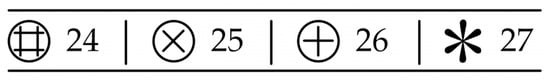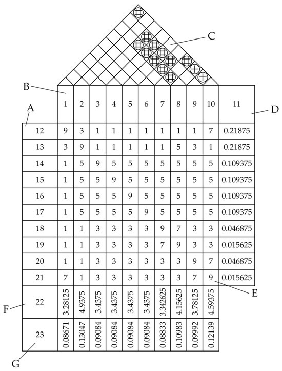 In Figure 7, Section A outlines design requirements; Section B details technical measures; Section C presents pairwise relationships between technical measures, with corresponding meanings illustrated in Figure 8; Section D shows weight values for design requirements calculated using Formulas (2)–(9); Section E indicates relationship values between different technical measures for individual design requirements; Section F calculates technical measure importance values through Formula (10) using Sections D and E; Section G derives further analysis weights for technical measures from Formula (11). The meanings of the numbering in Figure 7 and Figure 8 are shown in Table 6.