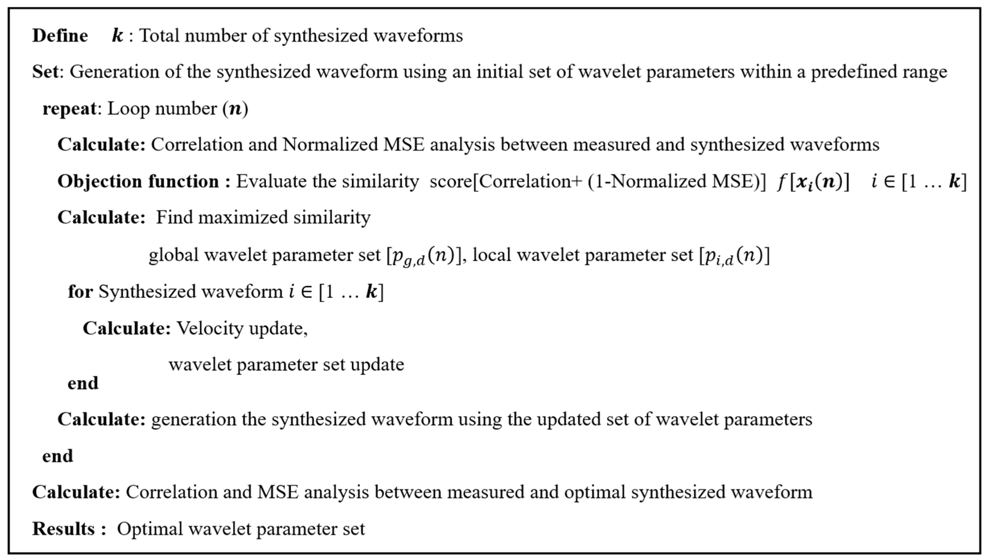 Pseudocode of the PSO algorithm for the search of the optimal wavelet parameter set for the synthesized waveform. The objective function was defined as a composite of correlation and normalized MSE to improve reliability and robustness.