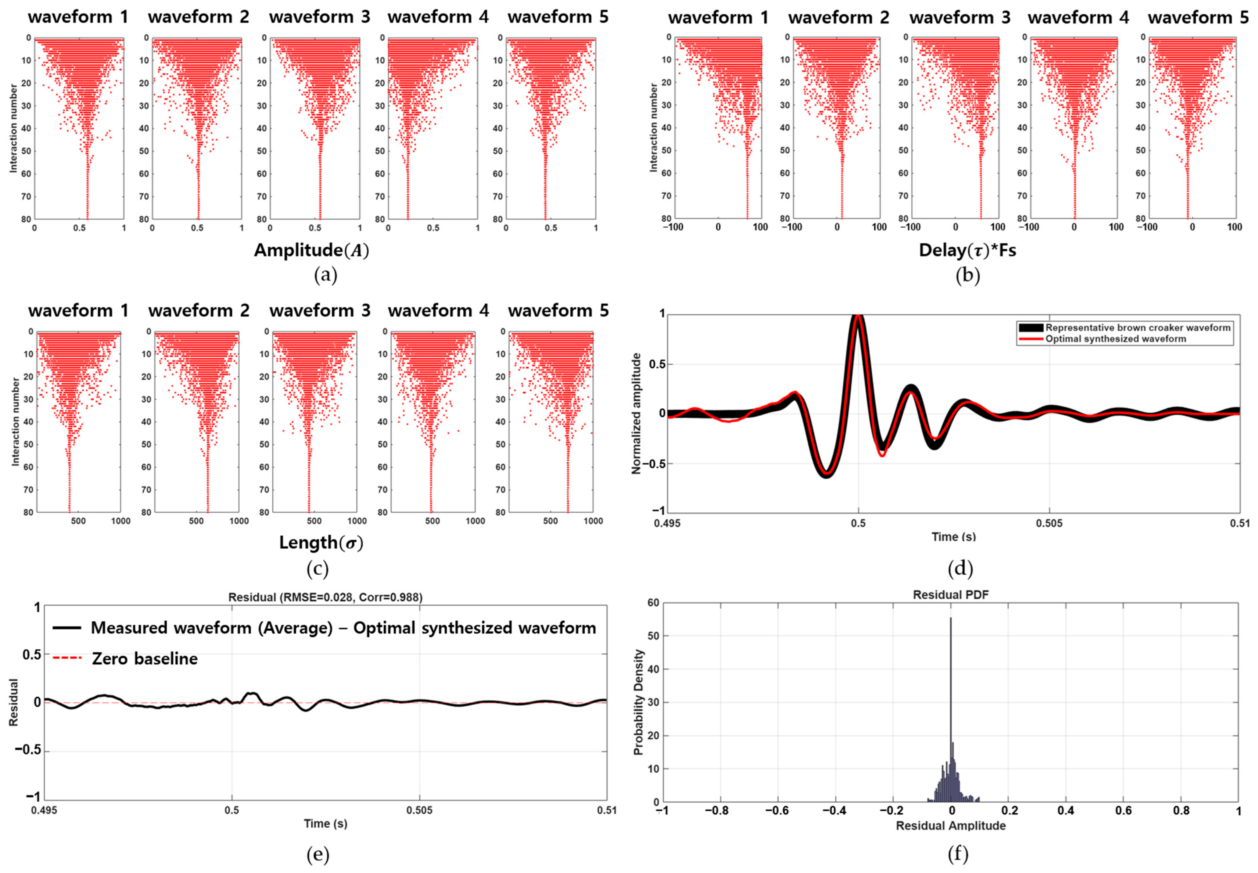 Figure 3d compares the time-domain waveforms of the representative measured brown croaker call (black line) and the corresponding synthesized waveform (red line) reconstructed using the optimized parameters, showing a close agreement in the time domain. The residual analysis (