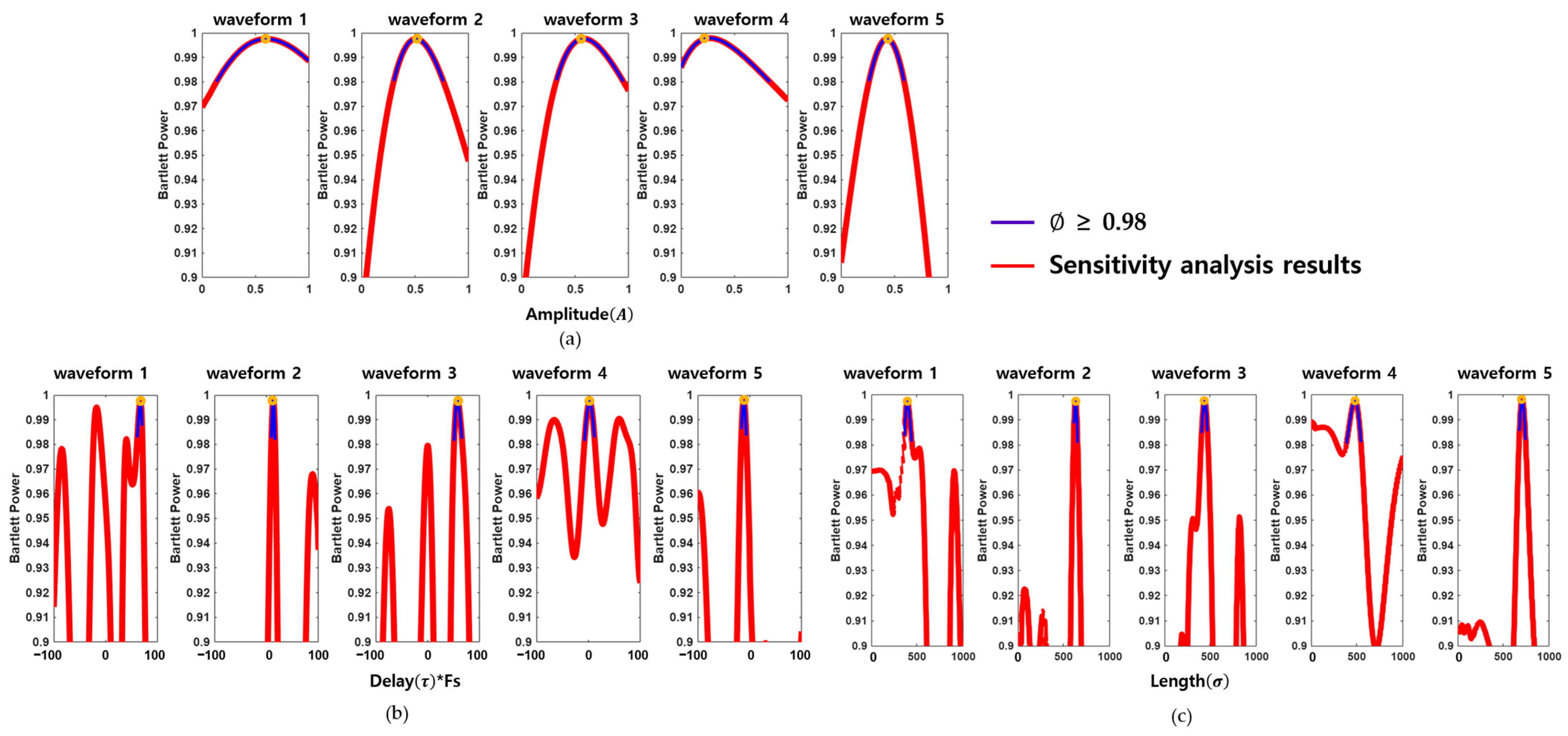 Sensitivity analysis of wavelet parameters used in signal modeling. Plots in (a–c) show Bartlett power values for sensitivity plots for each wavelet parameter, where Bartlett power remains above 0.98, indicating robust synthesis similarity for each waveform.