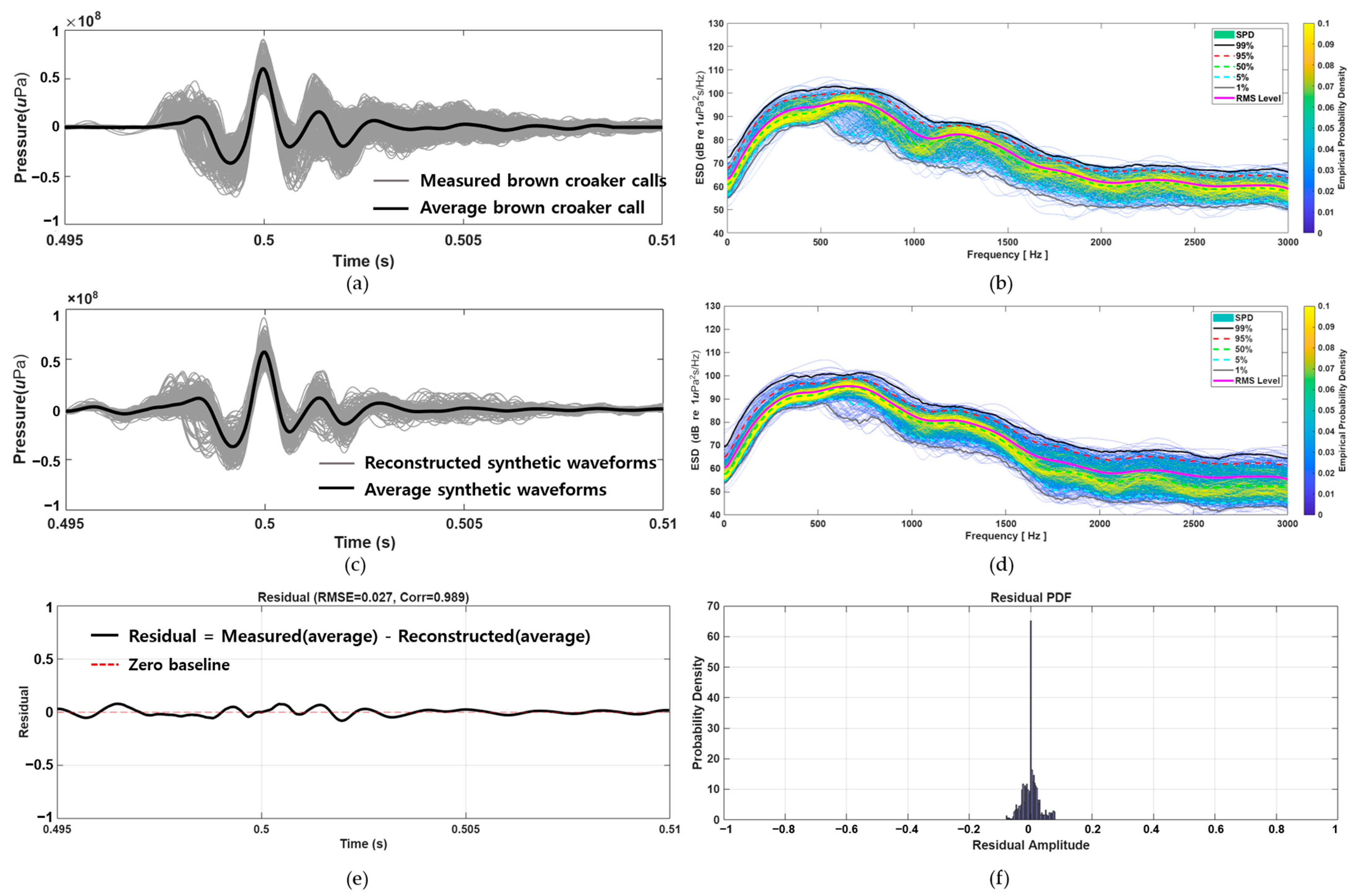 Time and frequency domain comparison between measured calls and reconstructed signals. (a) Superimposed measured brown croaker calls (gray) and their average (black). (b) ESD of measured calls with percentile curves and RMS level. (c) Superimposed reconstructed synthetic waveforms (gray) and their average (black). (d) ESD of synthetic waveforms showing close alignment with measured calls. (e) Residual waveform with RMSE = 0.027 and correlation = 0.989. (f) Probability density function (PDF) of residual amplitudes, confirming small reconstruction errors.