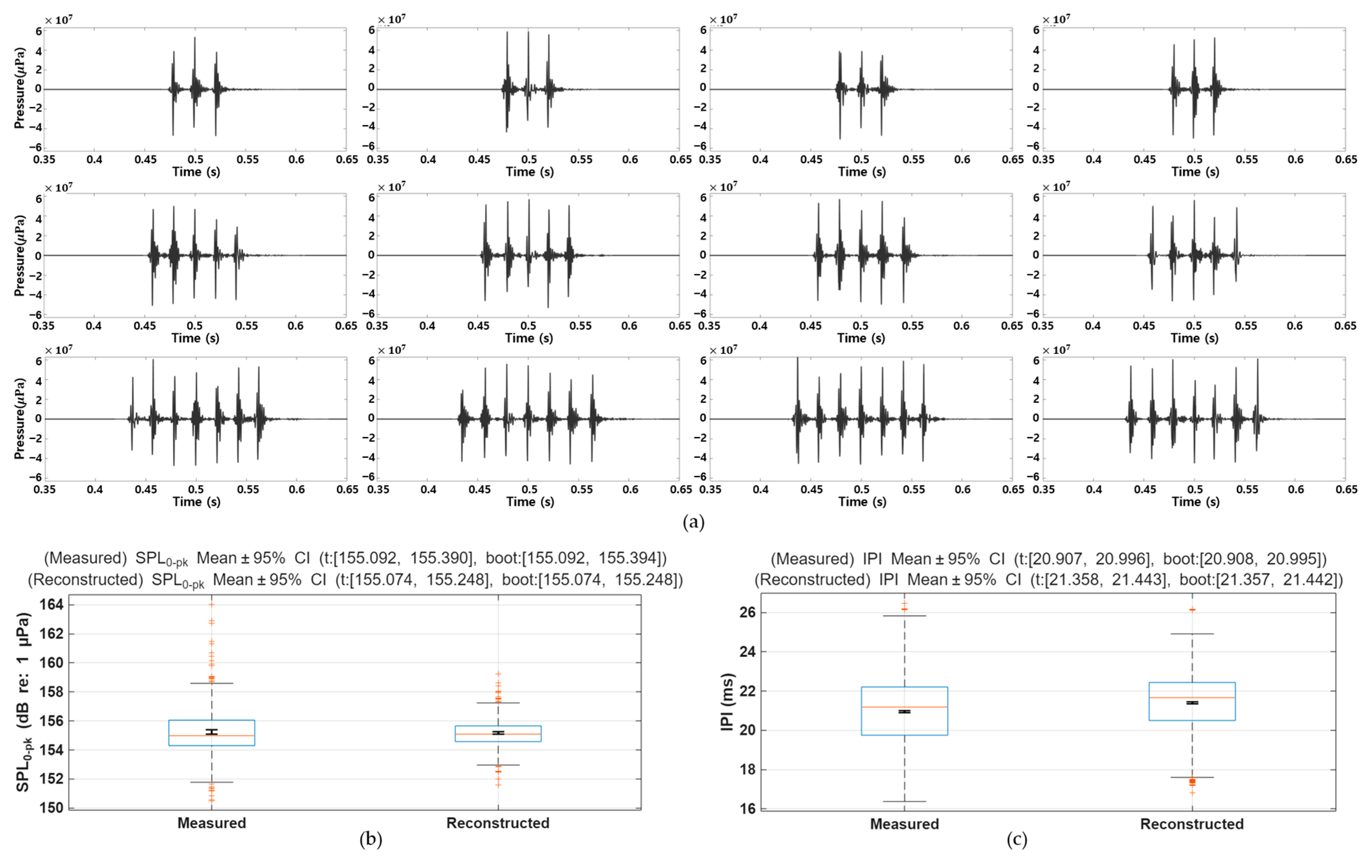 Reconstructed pulse train waveforms that replicate key acoustic features, using the proposed modeling framework. Reconstructed pulse train waveforms replicating key acoustic features of brown croaker vocalizations using the proposed modeling framework. (a) Examples of reconstructed pulse trains generated by concatenating individually synthesized pulses based on empirically derived inter-pulse intervals (IPI). (b) Boxplots of measured and reconstructed zero-to-peak sound pressure level (SPL0–pk) with mean ± 95% confidence intervals (CI), showing no statistically significant difference. (c) Boxplots of measured and reconstructed IPI with mean ± 95% CI, indicating a slight but consistent shift.