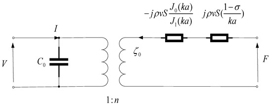 The stacked transducer consists of two piezoelectric wafers, which are connected in parallel to the electrical circuit structure and in series in the mechanical structure. Based on the cascade theory in electrical circuits, the electromechanical equivalent circuit diagram of the stacked transducer can be derived [28,29]. As shown in Figure 2, the admittance of the stacked transducer is the superposition of each piezoelectric wafer’s admittance. Therefore, the admittance of the dual-wafer transducer can be derived as follows: