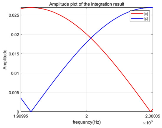 When , the transducer operates at resonance. At this point, the vibration frequency of the transducer is its resonant frequency. Let and . We solved the equation and plotted the graph in the range from 1,999,950 Hz to 2,000,050 Hz, as shown in Figure 3.