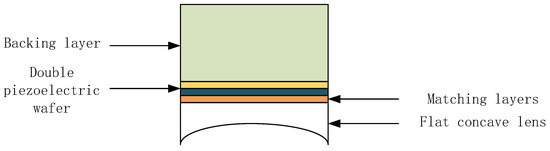 The structure of the dual piezoelectric wafer focusing transducer is shown in Figure 4 It consists of a backing layer, a matching layer, piezoelectric wafers, and plano-concave lenses.