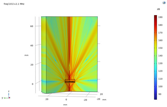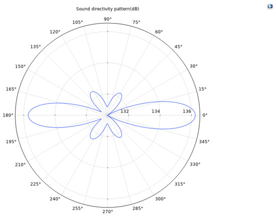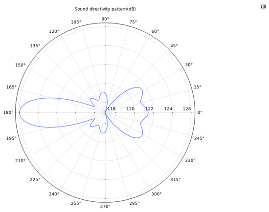 Based on the finite element method, a coupled numerical model including a solid mechanics module and an electrostatic module was established to simulate the acoustic field characteristics of the ultrasonic transducer. To accurately capture the propagation behavior of ultrasonic waves in the medium, the grid size is set to one-tenth of the ultrasonic wavelength, ensuring calculation accuracy while maintaining solution efficiency. After completing the transient or frequency domain solution, the sound field data was extracted and analyzed through the software post-processing function, and the far-field directivity distribution curve of the transducer was obtained. Meanwhile, a finite element model of the acoustic lens was established to analyze its focusing effect and its influence on the distribution of the sound field. Figure 6 and Figure 7, respectively, present the comparison results of the directivity curves of single piezoelectric chip and dual piezoelectric chip transducers under the same excitation conditions, which can visually reflect the differences in directivity characteristics such as beam width and side lobe level between the two, providing a basis for evaluating the performance of transducers and optimizing design. Figure 8 is a simulation diagram of the sound pressure when the ultrasonic transducer vibrates in water.