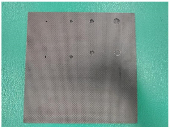This test block uses 4mm thick T800 carbon fiber panels provided by Ximeng Hardware Tools Store in Zhejiang. According to the national standard GBT 27664.1-2011 [30] “Performance and Inspection of Non-destructive Testing Ultrasonic Testing Equipment”, a flat-bottom hole was prefabricated at a depth of 1 mm below the front of the plate to detect defects in carbon fiber composite materials. The fabricated carbon fiber plate is shown in Figure 9.
