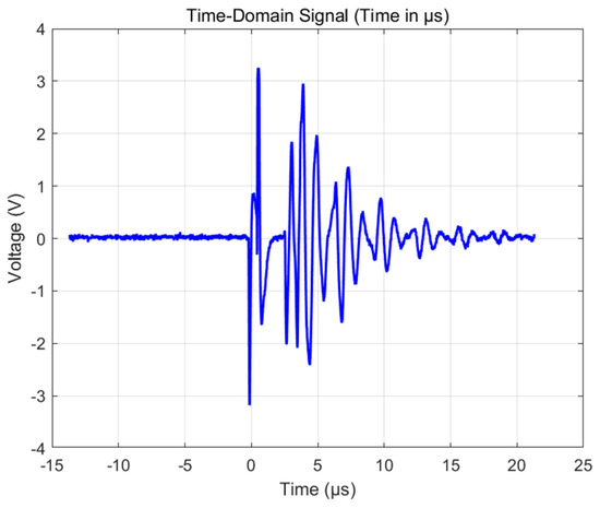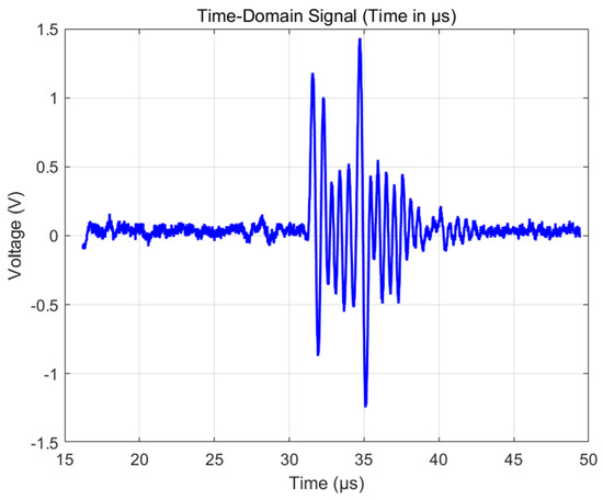 As shown in Figure 12, ultrasonic waves are reflected on the surface of the carbon fiber plate, generating the first echo signal with an amplitude range of −0.87 V to 1.17 V, and a sensor frequency of 1.88 MHz. After a delay of 3.2 µs, the sound wave was reflected back to the transducer through the defect, and the measured signal amplitude ranged from −1.24 V to 1.43 V. Based on the known sound velocity value of 3500 m/s in the carbon fiber composite material, the defect depth is calculated to be approximately 1 mm. Figure 13 and Figure 14 show the measurement results of the defective area by Olympus’ 1 MHz standard probe. The transducer detects that there is basically no difference between the defective area and the non-defective area, and, therefore, cannot accurately distinguish between the defects in carbon fibers. The result indicates that the developed ultrasonic transducer has successfully achieved the detection and depth positioning of internal buried defects in carbon fiber plates.