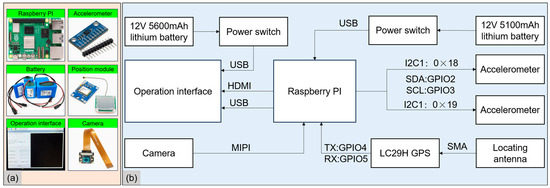Currently, there is a lack of dedicated instruments designed exclusively for cycling vibration testing, and many existing studies rely on the integration of multiple devices to capture relevant data [9,15,16]. However, such an approach is not only cumbersome but also prone to errors resulting from timestamp discrepancies between different instruments. To address these challenges, this study developed an integrated dynamic cycling vibration testing system. The proposed hardware system features one-touch start and stop functionality, parameter configuration, and real-time data display, significantly streamlining the testing process while enhancing data acquisition accuracy and consistency. The system is mounted on the bicycle’s handlebars and comprises 6 core modules: a microcontroller, a triaxial vibration accelerometer, a GPS module, a camera module, a touchscreen interface, and a power management unit. The system is illustrated in Figure 1, and the overall integration of the instruments is shown in Figure 2.