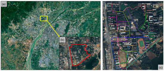 This study tests the hardware system on various road surfaces to validate its stability and universality. The tests are conducted under minimal traffic and pedestrian flow to mitigate external interference. Urban road networks, while dense, predominantly feature high-quality asphalt surfaces, presenting a limited variety for testing. Additionally, the dense vehicular and pedestrian traffic can distract cyclists, potentially skewing the test results. Rural roads offer a diverse range of surfaces but are too dispersed to allow for concentrated testing efforts. Consequently, this study opts for the campus roads of East China Jiaotong University as the testing site. Located in the Economic and Technological Development Zone of Nanchang, China (as shown in Figure 3a,b), the campus boasts a dense road network with a mix of asphalt and cement surfaces of varying quality, effectively capturing the vibration characteristics of cycling across different road conditions. Moreover, during specific timeframes, the area experiences relatively low traffic and pedestrian volumes, providing the requisite quiet environment for testing. Given the density and complexity of the road network within the campus, to prevent redundant testing and reduce potential errors therefrom, this study meticulously classified and planned the testing routes in advance, ensuring the independence and accuracy of each test segment, as depicted in Figure 3c.
