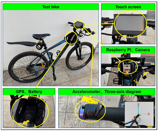 This study employs an on-site field testing methodology. The vibration data collector was a healthy 25-year-old male, 180 cm tall and weighing 75 kg, who performed the tests in a bent-over posture. He is an avid cycling enthusiast with extensive riding experience, having accumulated over 15,000 km in the past decade. The testing was conducted in three sequential steps. First, the environmental conditions of the testing site are assessed. Cyclists experience heightened stress when navigating through complex traffic environments [4], thus, it is imperative to ensure minimal vehicular and pedestrian traffic to substantially reduce external interference affecting the test results. Second, the installation and calibration of the equipment are carried out. As illustrated in Figure 4, the positioning module, microcontroller, and touch display are securely mounted on the handlebars, with vibration-damping foam placed at contact points to prevent potential damage from excessive vibrations during the test. The accelerometer is installed at the point where the hand contacts the handlebar and is precisely calibrated using a level to ensure its z-axis is perpendicular to the ground, x-axis aligns with the direction of travel, and y-axis points horizontally. Finally, the instruments are activated, and relevant parameters are adjusted as necessary to commence testing. To accurately reflect vibration intensity, the starting and ending points of the cycling test are set beyond the actual test segment to ensure cyclists reach and maintain the predetermined speed (16–20 km/h as specified in this study) upon entering the test segment until exiting the endpoint. Throughout the test, cyclists must adhere to the predetermined route to maintain consistency in the test path, avoiding handlebar sway and abnormal acceleration or deceleration behaviors that could skew the results. Each test exceeds 60 s in duration. Following test completion, the data quality is rigorously assessed. Any irregularities, including signal dropout or atypical measurements, render the dataset invalid and necessitate a retest.