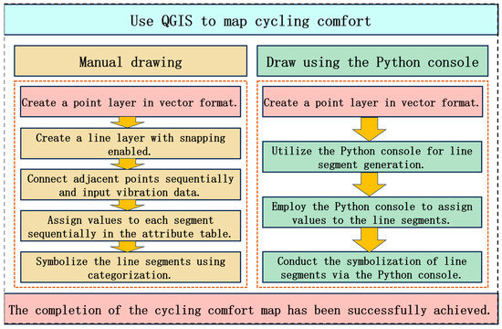 In this study, QGIS Desktop 3.34.12 was employed for the generation of cycling comfort maps. Two primary methods are available for map rendering: manual drawing and automated scripting via the Python 3.13 console. While the manual approach is relatively straightforward, it becomes cumbersome and inefficient when handling large-scale datasets. Moreover, it is susceptible to human-induced errors, which may lead to cumulative inaccuracies. In contrast, Python-based automation enables high-throughput processing, making it well-suited for large datasets by offering superior efficiency and minimized error propagation. Given the substantial data volume involved in this study, Python scripting was selected for map generation, with route segmentation refined at a per-second resolution. This approach aims to demonstrate the variations in vibration rather than to directly evaluate vibration levels. The specific mapping workflow is illustrated in Figure 5. During map rendering, data beyond the designated start and end points of the test segment must be trimmed, ensuring that only the relevant road section is retained for analysis.