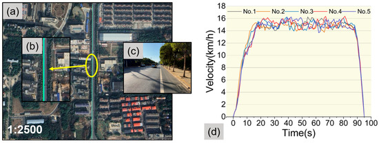 Cycling trajectories and speeds from five rides. (a) Test location; (b) Cycling trajectories from five rides; (c) Reference white line on the test route; (d) Cycling speed recorded by the hardware system.
