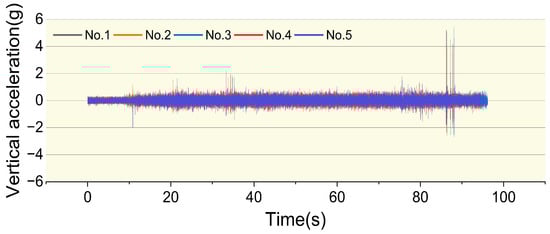 To assess the reliability of the vibration data, while testing cycling speed and trajectory, the accelerometer simultaneously recorded vibration data at a sampling frequency of 400 Hz during the five rides. The vibration data collected by the hardware system must exhibit sufficient stability to ensure its reliability in practical applications. Figure 7 presents the unprocessed raw vibration signals in the z-axis obtained by the cycling vibration dynamic testing hardware system during the five rides.