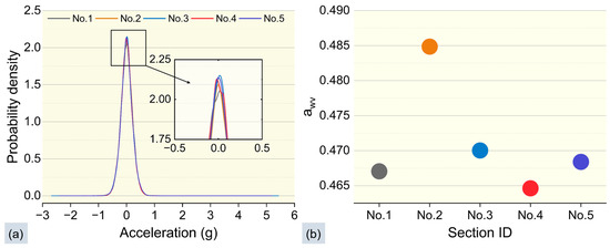 To analyze the collected vibration data, the Kolmogorov–Smirnov test was employed to obtain the probability density distribution curves of the vibrations. The results presented in Figure 8a demonstrate that the vibration acceleration values from the five rides follow a normal distribution, and the respective normal distribution curves exhibit a high degree of overlap, further validating the reliability of the hardware system in capturing vibration acceleration values. Additionally, Figure 8b presents the results of the vibration intensity values calculated for the five rides (the calculation method is detailed in Section 2.2.3), revealing that the errors in all five tests are below 0.1 m/s2.