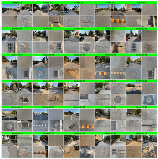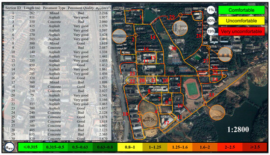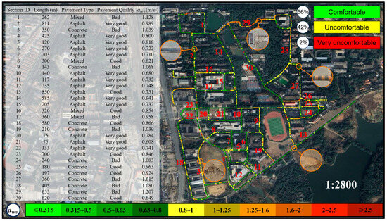 In this study, a total of 30 road segments were tested, covering a combined length of approximately 10.5 km, as illustrated in Figure 9. The test segments included various types of asphalt and concrete pavements. While a few segments consisted of newly paved roads, the majority exhibited varying degrees of pavement distress, such as potholes and cracks. Additionally, the test area featured multiple speed bumps and manhole covers, which could generate significant vibrations if riders did not reduce speed when passing over them, potentially causing discomfort to the cyclists.