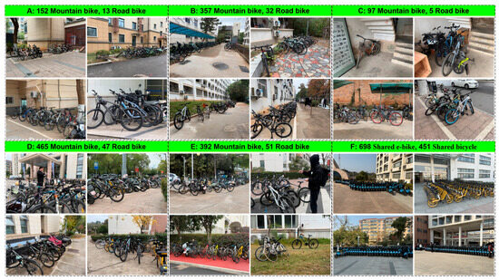 The test area was located on the campus of East China Jiaotong University. To ensure the test conditions closely aligned with actual usage scenarios, a comprehensive survey was conducted prior to the study, categorizing the existing bicycles on campus by zones. The university currently has 1463 Mountain Bikes, 148 Road Bikes, 698 Shared E-bikes (concentrated in designated parking areas, not campus-wide), and 451 Shared Bicycles (concentrated in designated parking areas, not campus-wide), totaling 2760 bicycles, as illustrated in Figure 10.