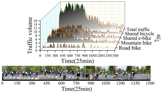 Additionally, to obtain more realistic and accurate data on vehicle usage, this study recorded traffic flow data through time interval photography at a crossroad near the teaching buildings of East China Jiaotong University. The observation was conducted from 9:40 a.m. to 10:05 a.m., lasting for 25 min. This methodology can also be applied to urban traffic flow statistics. As illustrated in Figure 11, during this period, a total of 71 Road Bikes, 354 Mountain Bikes, 393 Shared E-bikes, and 337 Shared Bicycles passed through the intersection, amounting to 1155 vehicles in total.
