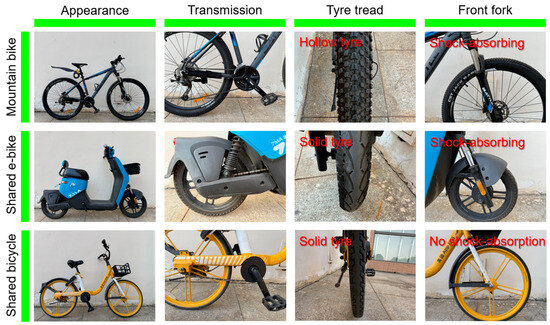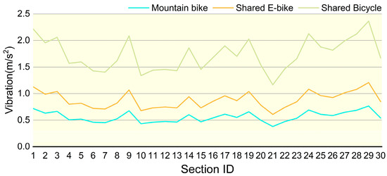 During the testing process, the tire pressure of the Mountain Bikes was maintained at 80 MPa, with measurements conducted hourly to ensure consistent pressure across all road segments. Both Shared E-bike and Shared Bicycles were equipped with solid tires, thus eliminating the influence of tire pressure. Suspension systems were activated on Mountain Bikes and Shared E-bikes, whereas Shared Bicycles lacked any suspension. Furthermore, to assess potential variability among different vehicles of the same category, vibration tests were randomly performed on three units each of Mountain Bikes, Shared E-bike, and Shared Bicycles along identical routes at uniform riding speeds. The results indicated minor variations among vehicles of the same type; however, these differences did not significantly affect the validation of the testing methodology.