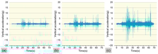Unprocessed raw vibration signals obtained by the Riding Vibration Dynamic Testing Hardware System (Using Route 1 as an example). (a) Mountain Bike; (b) Shared E-bike; (c) Shared Bicycle.