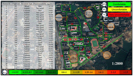 This study integrates vibration acceleration data with latitude and longitude data to construct a map for assessing cycling comfort. Based on the three most frequently used types of cycling vehicles on the campus of East China Jiaotong University—Mountain Bike, Shared E-bike, and Shared Bicycle—the map categorizes cycling comfort into three main levels: green (comfortable, ), yellow (uncomfortable, ), and red (very uncomfortable, ). To provide a more refined expression of comfort, the study further divides these levels into ten subcategories, as shown in Table 3. This method not only visually displays the spatial distribution of cycling comfort on roads but also provides quantitative data support for road management authorities to plan and maintain infrastructure more effectively. For example, in “red” zones, road management authorities can implement targeted maintenance or localized repairs to improve cycling comfort. Compared to traditional vibration measurement methods (such as visual inspections or subjective rider feedback), the comfort map-based evaluation approach offers significant advantages. It not only helps road management authorities scientifically assess the service level of road infrastructure but also provides cyclists with valuable references for route selection, thereby further promoting the sustainable development of bicycle transportation.
