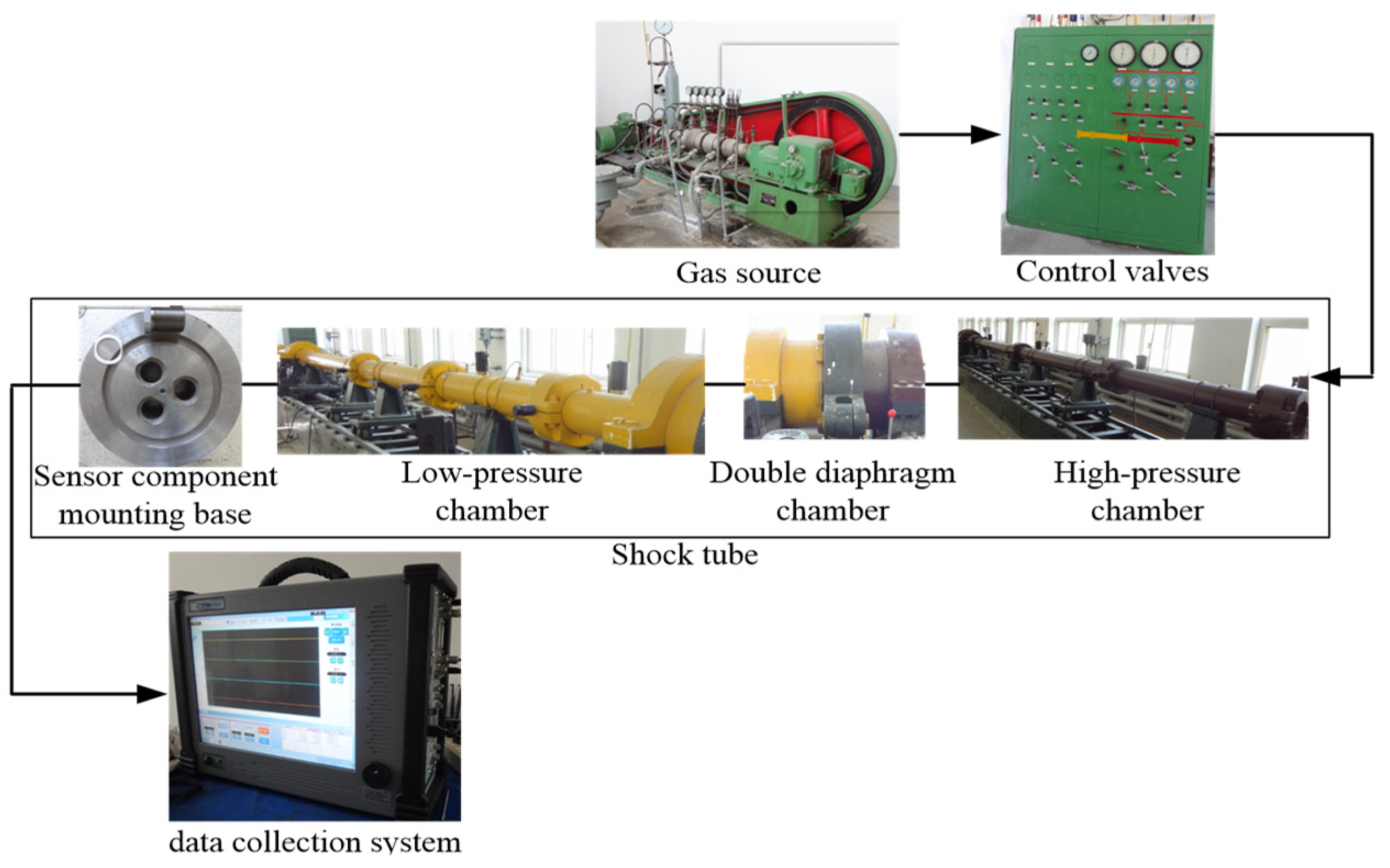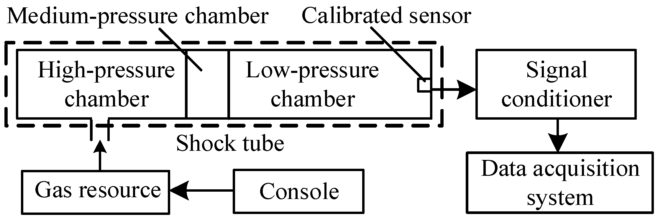 - Yao, Z.; Li, Y.; Ding, Y.; Wang, C.; Yao, L.; Song, J. Improved shock tube method for dynamic calibration of the sensitivity characteristic of piezoresistive pressure sensors. Measurement 2022, 196, 111271. [Google Scholar] [CrossRef]