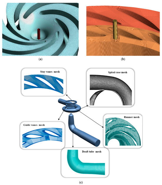 For the runner components, an unstructured tetrahedral mesh was generated using CFD ICEM software 2020. The boundary layer was locally refined to improve computational accuracy, and additional mesh refinement was applied to critical wall surfaces, including the guide vane surfaces, runner blades, and draft tube walls. The remaining computational domain was discretized with high-quality structured hexahedral grids. The model and mesh are shown in Figure 2a–c.