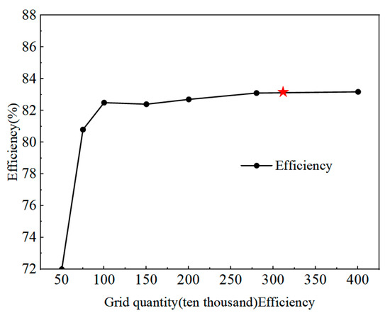 To reduce the influence of grid density on the computational results, six sets of meshes were generated to perform a grid independence test, as shown in Figure 3. It can be observed that the turbine efficiency increases with the number of grids. When the grid number reaches between 3.0 and 4.0 million, the turbine efficiency no longer shows significant variation, remaining between 82.7% and 82.8%. To ensure computational accuracy while saving resources, a mesh with 3.01 million elements was finally adopted.