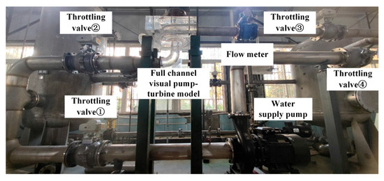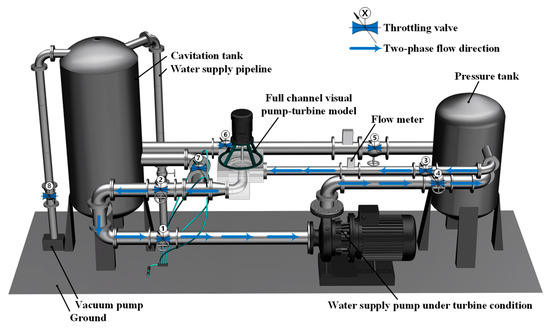 The experimental setup for investigating pump-turbine performance under pump operating conditions is shown in Figure 4 and Figure 5. The main components include a cavitation tank, vacuum pump, transparent acrylic test section, electromagnetic flowmeter, pressure tank, water supply pump, and pipelines. During the tests, the rotational speed was controlled by a frequency converter, and the inlet flow rate in turbine mode was adjusted by varying the water supply pump speed. Once steady conditions were reached, the inlet and outlet pressure signals at identical turbine points were recorded repeatedly, and the arithmetic average was taken as the result.