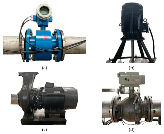 Schematic diagram of some test equipment. (a). Electromagnetic Flowmeter (b). Three-phase Asynchronous Motor (c). Water Supply Pump (d). Electromagnetic Ball Valve.