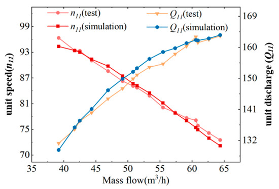 To ensure the accuracy of the numerical simulations, this study adopts a combined approach of numerical simulation and experimental measurement. The experimental results are used to validate the calculated unit speed and unit flow rate, thereby further verifying the reliability of the simulation. The parameters of the pump-turbine are described using the dimensionless quantities of unit speed and unit flow rate . Specifically, the unit speed refers to the rotational speed of a geometrically similar pump-turbine with a runner diameter of 1 m and an effective head of 1 m, while the unit flow rate represents the effective flow rate of such a geometrically similar pump-turbine under the same conditions. Consequently, these two unit parameters provide an intuitive means to validate the hydraulic characteristics of the pump-turbine operating in turbine mode.