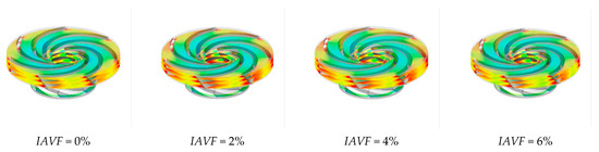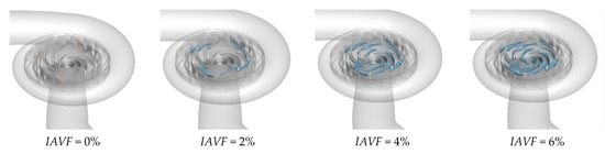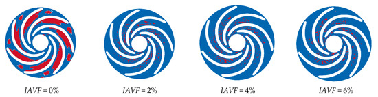 As shown in Figure 13, the distribution of the iso-surface with a gas volume fraction of 0.1 in the runner passage exhibits significant changes with increasing IAVF. When IAVF = 2%, only a small number of bubbles enter the passage, mainly concentrated in localized regions and distributed along the streamlines under fluid-induced motion, without fully occupying the passage. As IAVF increases to 4%, more bubbles enter the passage, and their distribution within the runner expands. Enhanced vortex and shear effects lead to a more uniform bubble distribution and a wider coverage area. When IAVF further increases to 6%, the higher aeration concentration results in a dense accumulation of bubbles, which tend to occupy the entire runner passage.