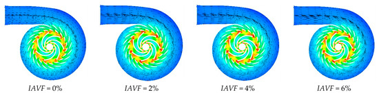 As shown in Figure 12, both the velocity and turbulent kinetic energy on the blade pressure side exhibit a “rise then fall” trend with increasing inlet air volume fraction (IAVF). At IAVF = 2%, the pressure-side velocity peaks at 8.84 m/s, and the turbulent kinetic energy reaches 0.95 kg·m2/s2. With further increases in IAVF, both gradually decrease, reaching 8.15 m/s and 0.847 kg·m2/s2 at IAVF = 6%.
