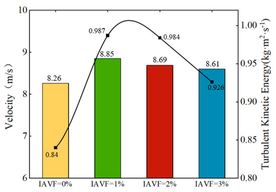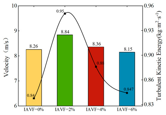 Similarly, the turbulent kinetic energy exhibits a comparable trend. Without aeration, the turbulent kinetic energy is relatively low (0.84 kg·m2·s−2). When aeration is introduced at IAVF = 1%, the turbulent kinetic energy sharply rises to its maximum value of 0.987 kg·m2·s−2. With further increases in aeration to 2% and 3%, the turbulent kinetic energy slightly decreases to 0.984 kg·m2·s−2 and 0.926 kg·m2·s−2, respectively.