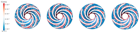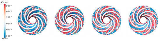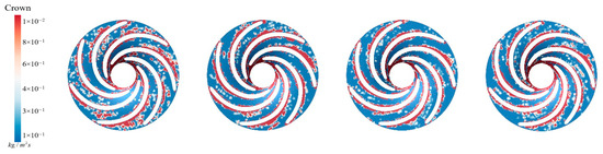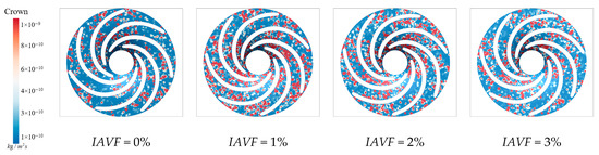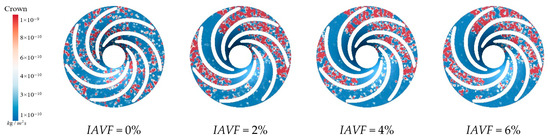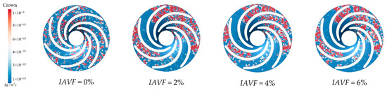 As shown in Figure 14, under no aeration IAVF = 0%, sediment deposition is relatively dispersed and randomly distributed throughout the passage. When IAVF = 2%, sediment begins to accumulate on the blade working surfaces, although the overall deposition remains high, indicating that the initial aeration has limited effect on sediment deposition. At IAVF = 4%, sediment accumulation becomes more pronounced, while the total deposition decreases further, suggesting that aeration increasingly influences sediment transport and deposition. At IAVF = 6%, the deposition area is significantly reduced, and the overall sediment amount is minimized, indicating that high aeration concentration effectively suppresses sediment accumulation on the crown. As shown clearly in Figure 14, after aeration, for the upper crown, the buoyancy of bubbles is enhanced, providing stronger lift to sediment particles, with some particles being re-entrained into the main flow, thereby reducing deposition. The introduction of bubbles also increases the turbulence intensity in the flow, causing stronger perturbations to particle trajectories, which makes it difficult for large deposition areas to form within the passage.