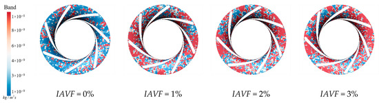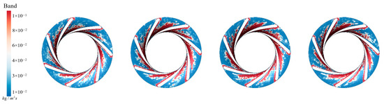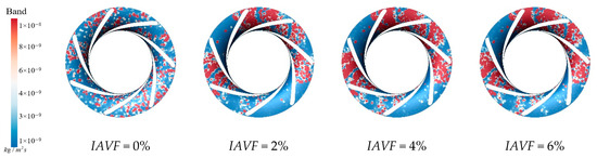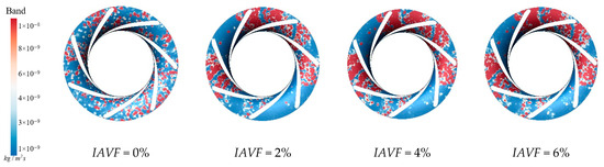 As shown in Figure 16, under no aeration, IAVF = 0%, sediment deposition is randomly distributed and mainly concentrated near the blade regions. When IAVF = 2%, the deposition area expands compared to the no-aeration case, although the overall distribution remains relatively uniform. At IAVF = 4%, sediment becomes more concentrated, particularly near the blade working surfaces. With IAVF = 6%, sediment deposition is most pronounced, indicating that high aeration concentrations promote sediment accumulation within the lower band. Figure 16 illustrates that aeration affects the vortex characteristics within the blade passage, enlarging the low-velocity recirculation zones, which makes sediment more likely to accumulate and deposit in these areas. Additionally, aeration increases the pressure gradient near the guide vane working surface, causing the resultant force on sediment particles in the flow field to direct toward this region. Consequently, sediment gradually concentrates near the guide vane working surface.