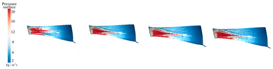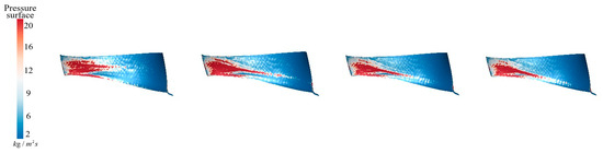 Figure 11 shows the velocity variation along the pressure surface of the blade at different air injection concentrations. As illustrated, when IAVF = 0%, the velocity near the leading edge of the blade is relatively high. After air injection IAVF > 0%, the leading-edge velocity further increases, but the rate of increase gradually diminishes with higher aeration levels. In contrast, the mid-span velocity of the blade significantly decreases after air injection, with the reduction becoming more pronounced as IAVF increases, reaching the maximum decrease at IAVF = 6%. At IAVF = 0%, the trailing-edge velocity is the lowest; with increasing IAVF, the trailing-edge velocity gradually rises and attains its maximum at IAVF = 6%.