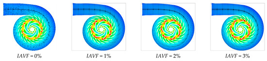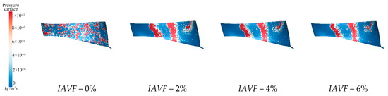 As shown in Figure 25, the maximum velocity and turbulent kinetic energy on the blade pressure surface under different IAVF conditions exhibit distinct trends. With the introduction and gradual increase in aeration, the maximum velocity on the blade pressure surface initially increases and then gradually decreases. Specifically, at IAVF = 1%, the maximum velocity reaches 8.85 m/s, showing a significant increase compared to the no-aeration case, IAVF = 0%, 8.26 m/s. As IAVF further increases to 2% and 3%, the maximum velocity decreases to 8.69 m/s and 8.61 m/s, respectively, indicating that higher aeration concentrations gradually reduce the peak velocity on the pressure surface.