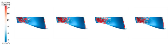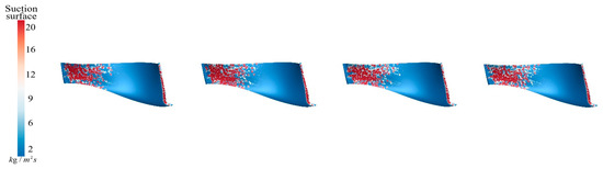 As shown in Figure 30, with IAVF gradually increasing from 0% to 1%, 2%, and 3%, the primary sediment deposition on the runner blade working surfaces shifts slightly from the initial concentration near the blade leading edge and mid-section toward the lower part of the blade. However, it is noteworthy that the original deposition at the leading edge and mid-section does not significantly decrease across these aeration conditions. Therefore, simply increasing IAVF does not effectively reduce sediment accumulation in the leading and mid-regions. With higher aeration, new low-velocity or recirculation zones may form near the lower portion of the guide vanes due to altered pressure gradients. Under the coupled effects of the gas–liquid phase and sediment particles, sediment gradually migrates downward and accumulates again, resulting in pronounced deposition in the lower regions.