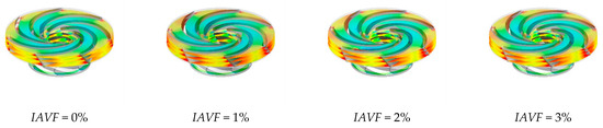 Figure 15 illustrates the sediment erosion on the runner crown under different aeration concentrations. Without aeration, IAVF = 0%, sediment erosion is relatively dispersed across the crown, with some flow passages experiencing more severe wear. As the aeration concentration increases, IAVF = 2%, 4%, 6%, the overall erosion on the crown gradually decreases, with erosion primarily concentrated in certain flow passages while other regions experience significantly less wear. Simultaneously, the sediment deposition on the crown surface also decreases with increasing aeration, especially at IAVF = 4% and 6%, where the total sediment deposition is significantly reduced. As shown in Figure 15, aeration reduces sediment deposition on the upper cover surface, fundamentally decreasing the degree of sediment-induced wear. As the aeration concentration increases, the presence of bubbles carries a portion of sediment particles further downstream, preventing them from depositing on the upper cover surface. This results in a reduction in sediment accumulation on the upper cover, thereby mitigating erosion and wear.