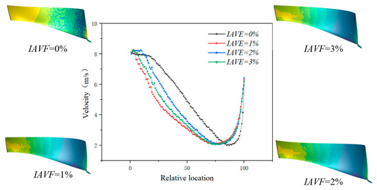 As shown in Figure 24, the velocity profiles along the blade pressure side under different IAVF conditions exhibit distinct variations. At the leading-edge region, the velocity with aeration is consistently higher than that without aeration (IAVF = 0%), indicating a pronounced local acceleration effect at the blade inlet. However, as the flow develops into the 10–20% chord section near the leading edge, the velocity with aeration decreases rapidly and falls below that of the non-aerated case. In the mid-blade region, the velocity gradually decreases with increasing aeration concentration, with the reduction being more pronounced at higher IAVF values (2% and 3%). This is primarily attributed to the relative slip effect between bubbles and liquid, which increases flow resistance and energy dissipation. Approaching the trailing-edge region, the velocity recovers and becomes slightly higher than in the non-aerated condition.