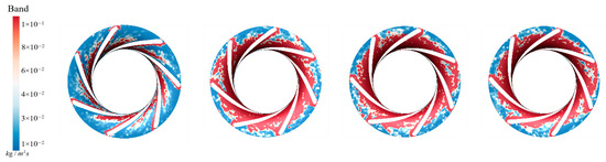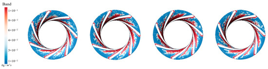 Figure 17 presents the sediment erosion distribution on the runner lower band under different aeration concentrations, IAVF. Without aeration, IAVF = 0%, sediment erosion is relatively uniformly distributed on the lower band surface, exhibiting a random pattern. As the aeration concentration increases, IAVF = 2%, 4%, 6%, erosion gradually concentrates in specific flow passages, and the erosion intensity increases. The trend shown in Figure 17 is consistent with the previously analyzed changes in sediment deposition in the lower shroud; that is, as the IAVF increases, the sediment deposition in the lower shroud also increases, leading to an intensification of local wear.