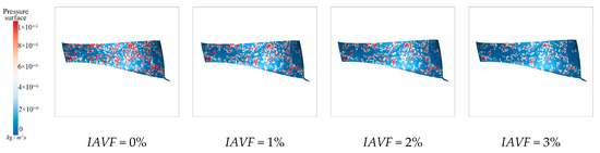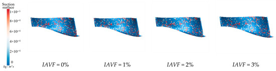 Figure 21 illustrates the sediment erosion distribution on the suction surface of the runner under different aeration concentrations, IAVF. Without aeration (IAVF = 0%, sediment erosion is relatively dispersed across the suction surface, with randomly distributed erosion locations. As the aeration concentration increases, IAVF = 2%, 4%, 6%, erosion gradually concentrates in the lower parts of the leading and trailing edges, while erosion in other regions is significantly reduced. This redistribution indicates that aeration causes sediment to accumulate near the leading and trailing edges, shifting the impact locations on the suction surface and forming localized high-erosion areas.