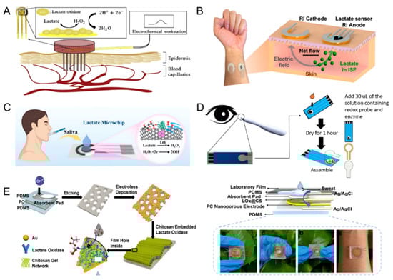 The application of an electrochemical lactate sensor for different biofluids. (A) Blood [46] Copyright 2020 Elsevier, (B) ISF [47] Copyright 2023 Elsevier, (C) saliva [48] Copyright 2024 American Chemical Society, (D) tears [49] Copyright 2018 Elsevier, (E) sweat [50] Copyright 2024 American Chemical Society.
