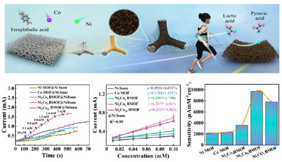 Illustration of the application of NixCoy BMOF@Ni foams in lactate sensing [60]. Copyright 2024 American Chemical Society.
