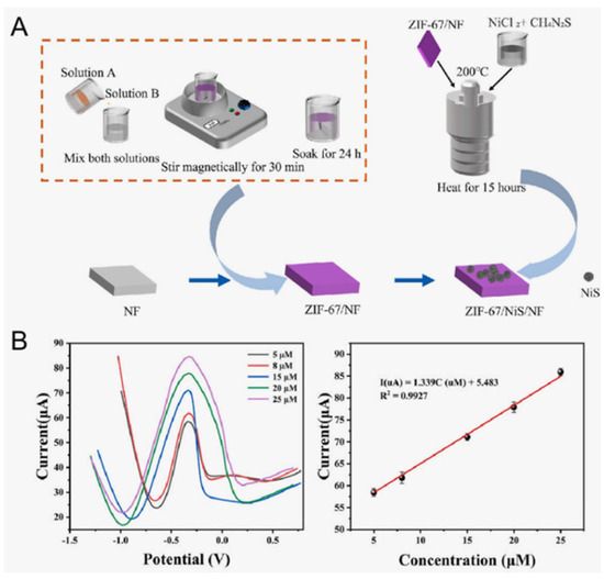 (A) Scheme of the synthesis method for the ZIF-67/NiS composite electrode. (B) The sensing performance of the ZIF-67/NiS electrode for lactate [63]. Copyright 2024 Elsevier.